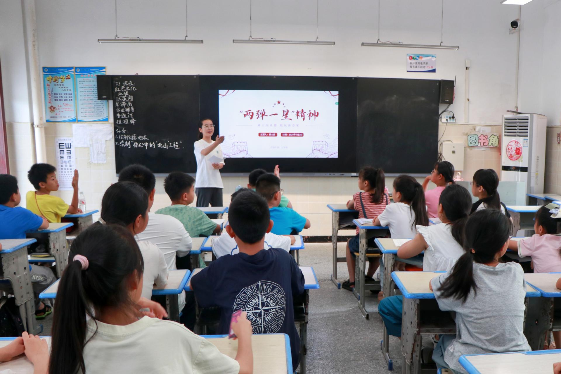 为深入学习贯彻习近平新时代中国特色社会主义思想和党的二十大精神,引导学生学习“两弹一星”精神,传承红色基因,7月2—5日,城市与环境科学学院经纬实践队(以下简称“经纬实践队”)在华中师范大学附属梧桐湖学校面向三至五年级学生开设了“两弹一星”主题课程,向学生们普及核科学知识,讲述中国“两弹一星”的发展历史,宣扬共产党人热爱祖国、无私奉献的“两弹一星”精神。