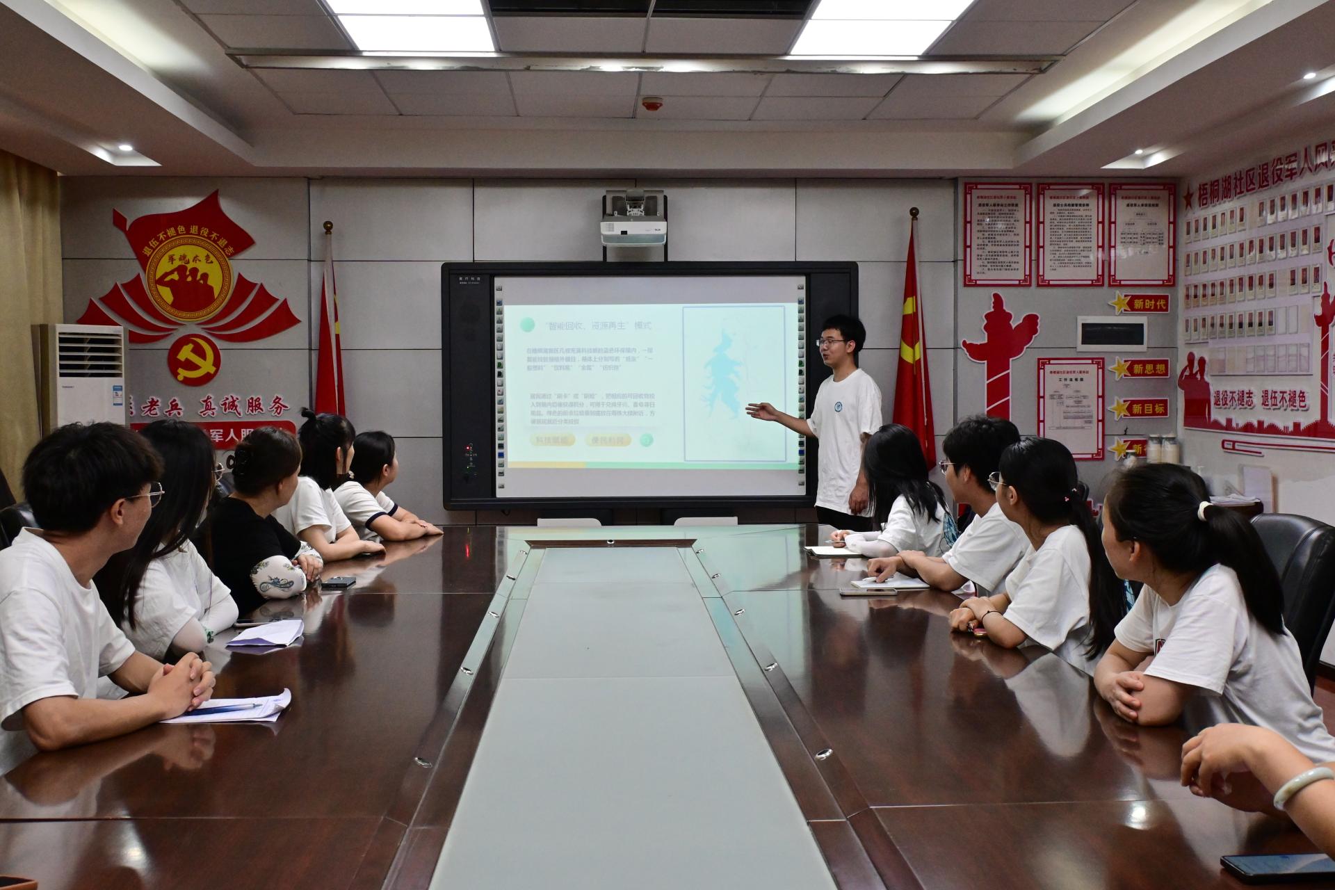 实践队首先来到梧桐湖社区居委会,通过交流,实践队得知目前社区已经建立了良好的垃圾分类宣传机制,包括每月进行一次垃圾分类的宣传活动,设立智能环保屋等,这些活动取得了积极的成效。随后,实践队员钟作鸿在居委会会议室向社区居民展开垃圾分类的宣讲,涵盖党建引领、落实红黑榜制度、垃圾分类“三机制”、治理“四模式”四个方面内容。