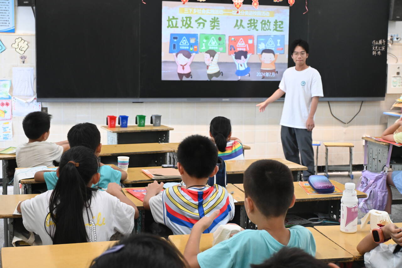 最后,实践队把垃圾分类理念带进课堂中,面向华中师范大学附属梧桐湖学校的小学生讲授垃圾分类主题教育课程。队员邓业山以问答的形式,引导学生自主思考,领悟环保的重要性,提出日常生活中环保节约的小行动,并鼓励学生们落实到生活中,提升了学生们的垃圾分类意识,动员更多的人加入垃圾分类的实践中。