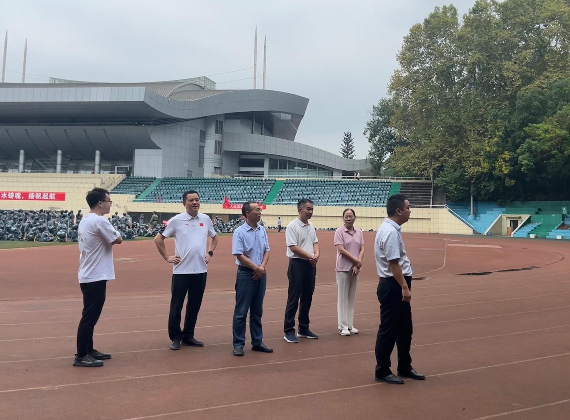 2024年9月13日,在中秋来临之际,学院党委书记吴成峡,正处职组织员曹慧东,副院长黄建武、刘目兴,党委副书记李志雄,院办主任杨毅,院团委书记刘新星,院团委副书记李澳一行前往佑铭体育场,看望并慰问2024级学生,为正在进行军训的新生们送去了中秋关怀,并分发月饼等物资。