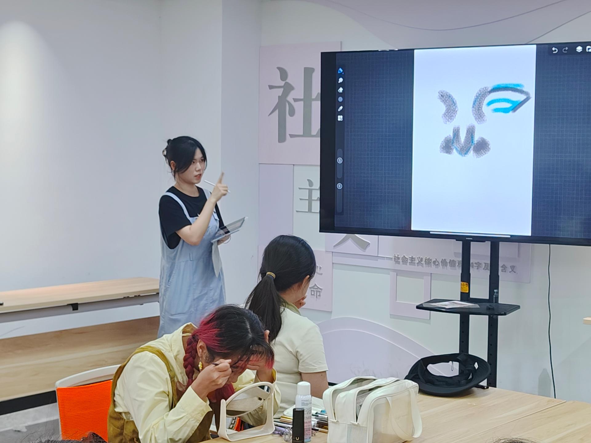 胡译匀首先向同学们介绍了不同肤质的特点和化妆品的种类,让同学们对化妆知识有了基本的认识。接着,她详细讲述了上妆的手法和顺序,着重强调了防晒、粉底液、口红选择的重要性。求职妆容的选择因人而异,胡译匀带着同学们了解自己的肤质、肤色与脸型特点,帮助同学们选择更适合自己的妆容。之后,她还画图分析,向同学们展示修容的具体上妆手法,并指导大家现场选择化妆品进行实操练习。