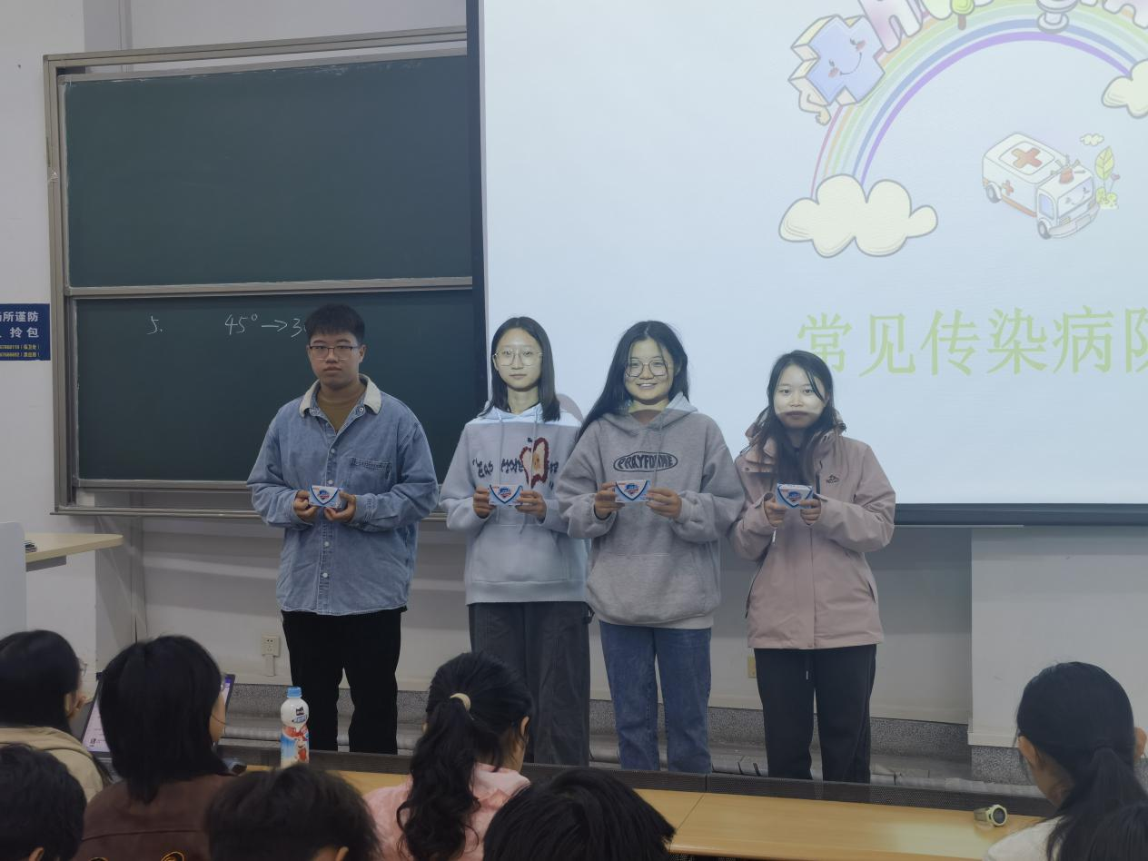 年级宣传部部长付雨薇围绕针对流行性感冒、流行性腮腺炎、诺如病毒、痢疾四类常见高发传染病,分别从病理原因、患病症状、治疗方式、预防保护四方面进行讲解,在讲解过程中穿插生动细致的科普视频,每小节后还设置了提问环节,在场同学们积极互动,争相抢答。最后,刘新星为四位抢答获奖的同学颁发活动奖品。