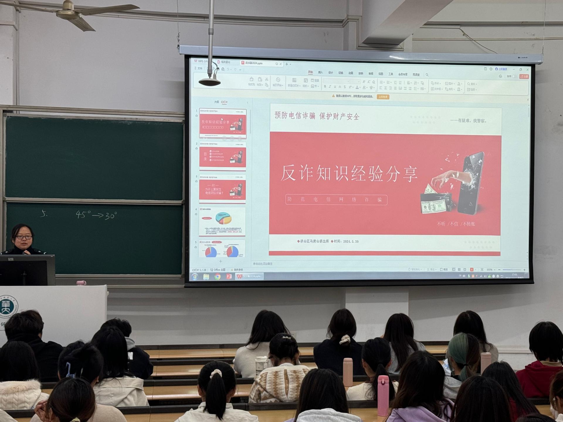 为提升大学生的反诈意识,强化自我保护能力,11月17日,城环学院2024级于9201教室开展反诈主题宣讲活动,本次活动邀请到洪山公安分局马房山派出所刘文娟警官进行反诈知识经验分享。本次活动由24级辅导员蔡乐主持。