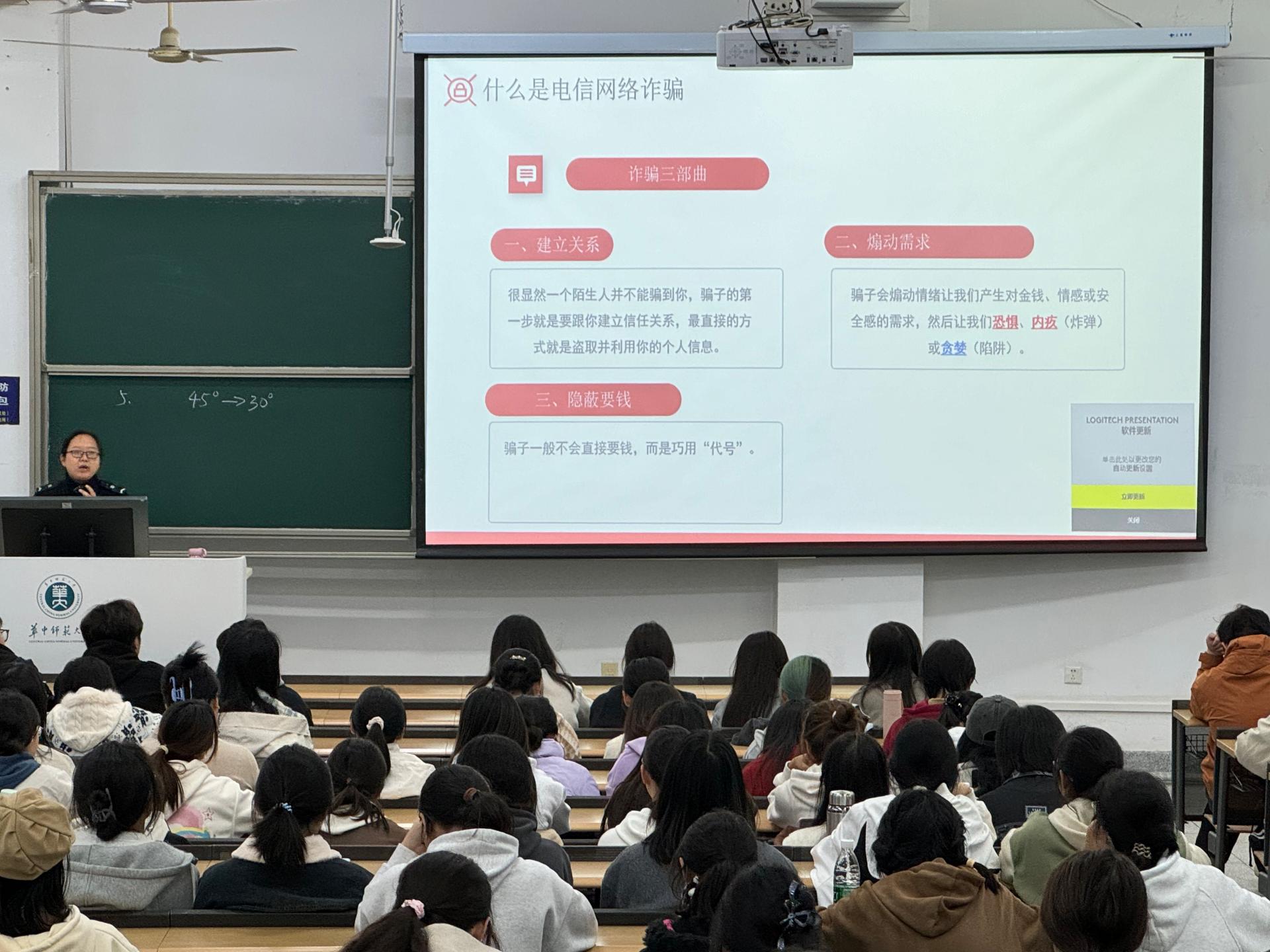 随后,刘文娟结合实际案例为同学们介绍了电信诈骗的主要类型:冒充类、赚钱类和敲诈勒索类,并用幽默风趣的语言告诫同学们当与网络上任何人有涉及金钱的互动时,记住三句话:与人谈钱要查清,被人威胁要查清,查不清楚就报警。