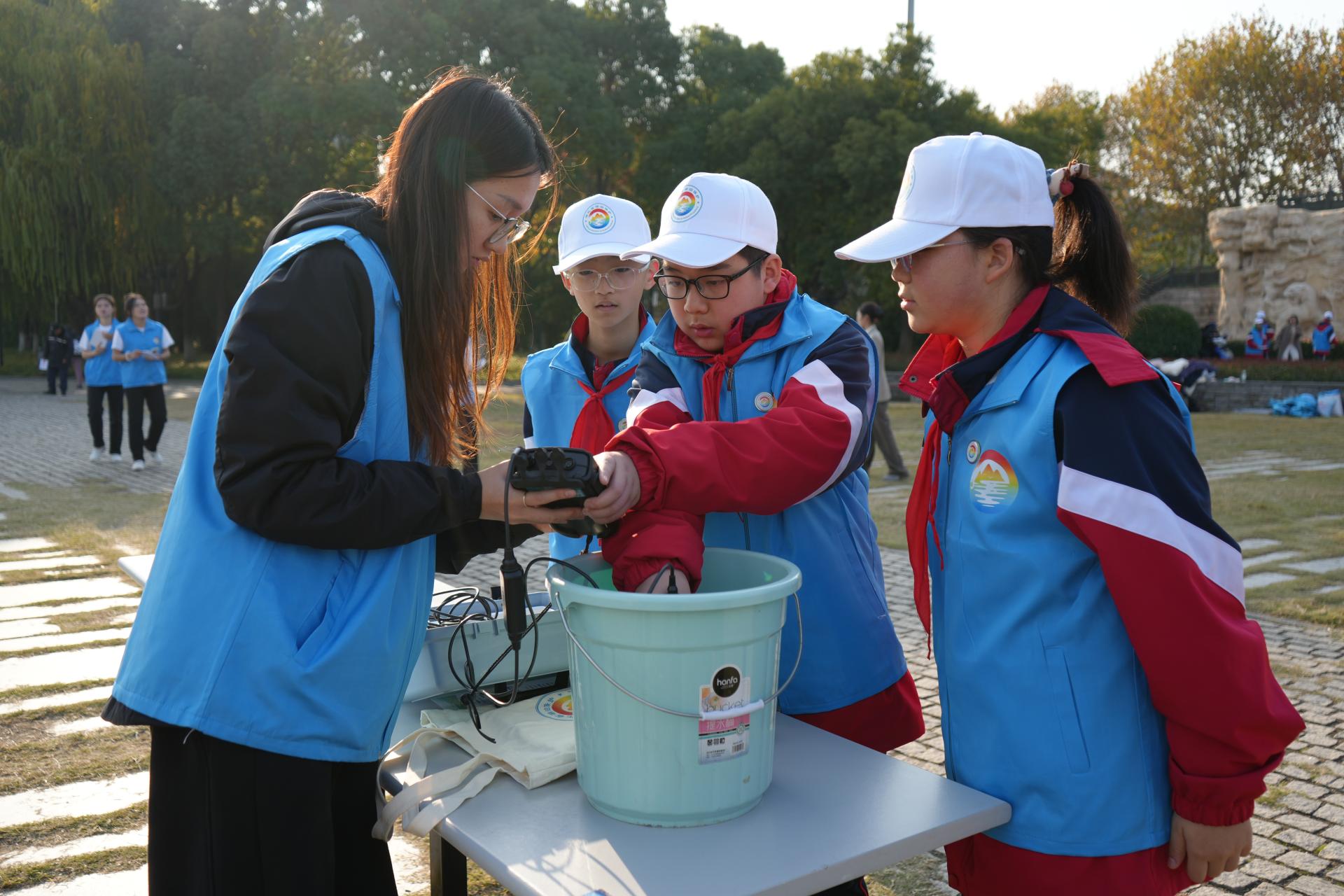随后,志愿者带领中学生们在附近水域进行水质检测,介绍仪器设备的功能、原理及注意要点,现场操作专业仪器测定长江水的溶解氧、pH值和电导率。中学生们积极参与,同时了解水文化和相关科普知识。