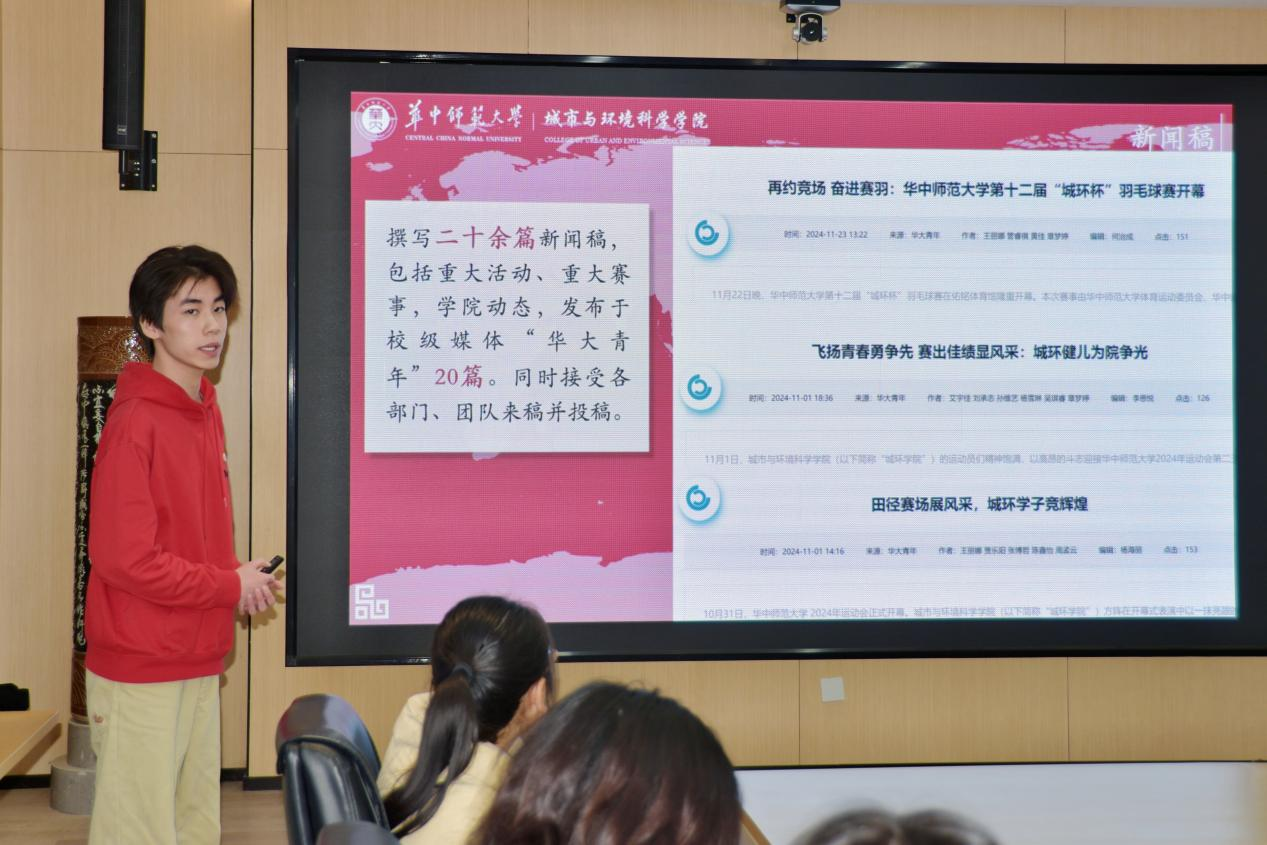 学院团委、学生会九个部门依次进行述职汇报。宣传中心主要负责人李继陈从重点宣传工作和媒体运营两方面出发,总结部门本学期的工作成果,并就提升宣传工作的质量提出建议;权益服务中心负责人许微从工作内容、部门建设、成员素质方面进行展示,并对后续工作做出明晰规划。随后,主席团成员总结本学期的工作内容并进行反思与展望。学生会主席团成员庄耀杰详细总结各部门的创新机制,鼓励各部门积极思考、加强创新,促进团学工作的进步与发展。