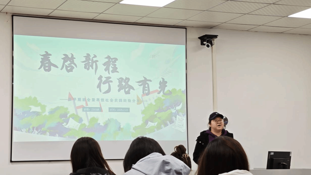 2月23日,2303班开展了新学期首次班会。班长曲翼如回顾了班级上学期收获 “院级最佳师范生集体” 等荣誉成果,团支书辛静微分享如何通过“云端支教” 提升课件制作能力与职业认知,组织委员陈宏杰用数据生动地展示班级同学的寒假劳动成果。最后,班主任陈京老师以 “时光”、“选择”、“温度” 为关键词,鼓励同学既要踏实学习,也要体验生活。此次班会加深同学们对实践和未来规划的认知,并激励同学们以饱满热情迎接新学期。