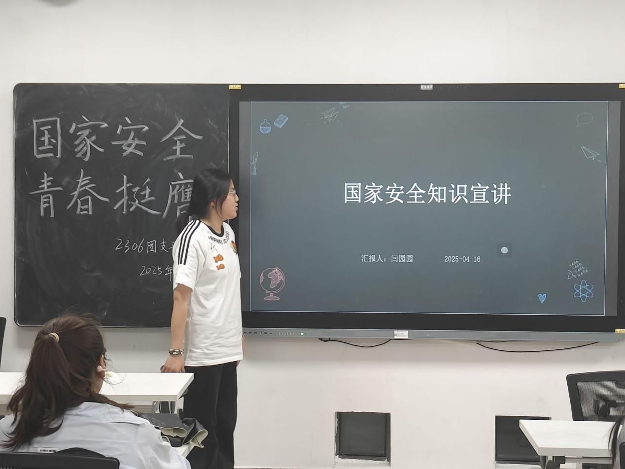 活动由团支书陈梦娴主持,安全委员闫园园进行宣讲。闫园园紧扣2025年《国家安全法》实施十周年这一重要节点,从国家安全的定义、核心领域、面临挑战及教育实践四个维度,进行了全面且细致的讲解。闫园园着重强调,国家安全不仅是国家利益的坚实屏障,更与每个人的生活紧密相连。在宣讲过程中,她结合生动鲜活的案例、准确详实的数据,深入剖析网络安全、生物安全、环境安全等新兴领域面临的传统与非传统威胁,引发了在场同学的深刻思考。