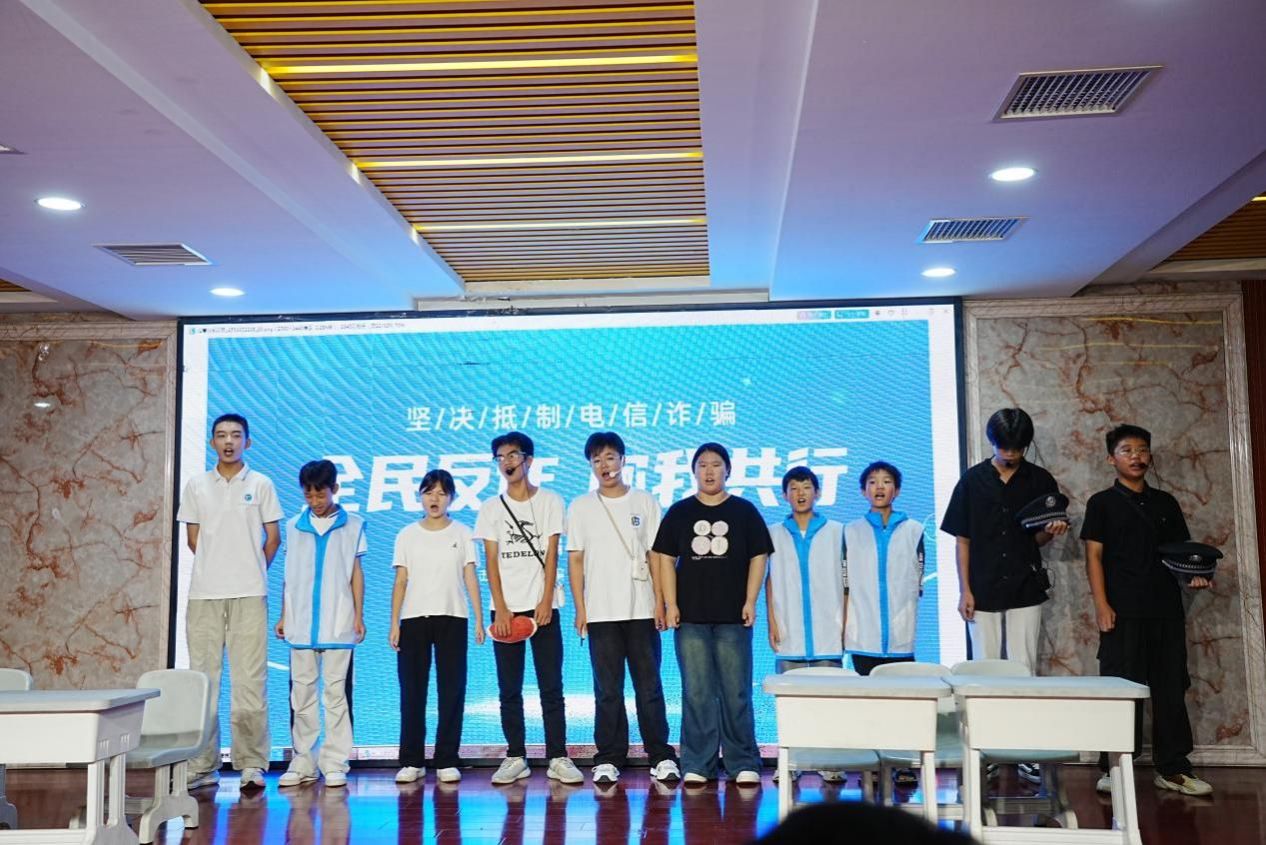 该剧由实践队队员李赐、周晗执笔创作,黄科翔、尚轩逸、周璟皓等10位学生参与演绎。小演员们以饱满的热情投入表演,将常见诈骗手法转化为直观剧情,巧妙地融入“不轻信、不透露、不转账”等反诈要诀以及“求助师长”“及时报警止损”等关键应对步骤,清晰有效地向台下观众传递了网络安全行为指南,让反诈意识入脑入心。