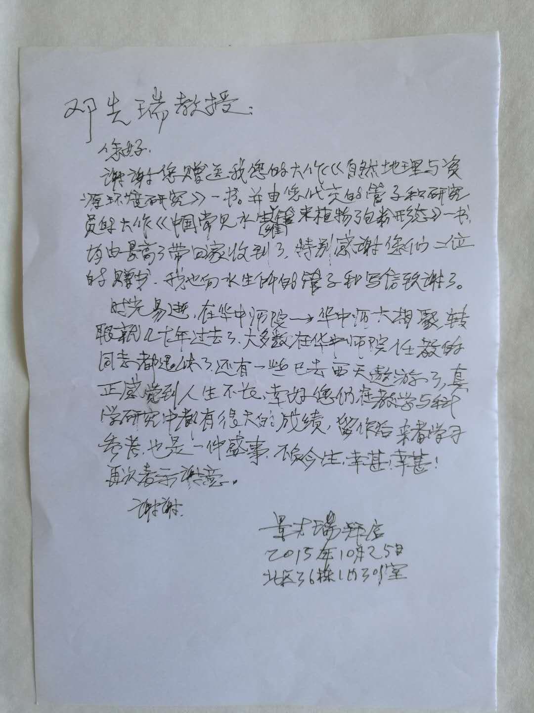 景先生待人随和,平易近人。学生向他请教时,他总能耐心释疑解惑,启发思考,引导探索,鼓励发表不同意见,特别是新见解。所以学生受益匪浅。不少学生毕业走向工作之后,仍与他保持联系,常来请教或看望他。我是景先生的学生,又同事几十载,并有过共同承担一项项任务的经历,如曾一度同时任湖北省职称评审委员会委员、一起主编《湖北省志·地理》等。他对我多有关心和鼓励,对我曾主持系里工作也给予了诸多支持。即使是在退休后,每当相见都会关切问候,互道珍重。2015年10月我的拙著《自然地理与资源环境研究》正式出版后,我特托景高了同志带去一本送给景先生并请他指正(同时还受托代为我大学同班学友官子和赠送了其撰写的一本著作)。他收到后,甚为高兴,并分别给我们写信致谢。让我深受感动,铭记于心。