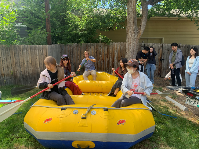 在野外实践培训环节中,学生们在Ethan老师的带领下了解了各类户外水上运动,并参与了陆地模拟户外漂流艇体验活动,在Ethan老师的指导下,亲身感受了水上运动的速度与激情。这项活动不仅锻炼了学生们的身体素质,还培养了他们的团队合作精神和勇于挑战自我的勇气。