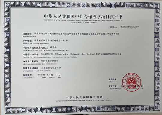 自然旅游与生态保护硕士(Master of Park and Protected Area Management,MPPM)项目经中华人民共和国教育部(教外函〔2021〕8号)批准设立(图1),由中国的华中师范大学与美国的科罗拉多州立大学联合举办,学业年限为三学期(1.5年),颁发美国高校文凭,是一种新型研究生培养模式。本项目旨在培养具有国际视野的自然旅游与生态保护领域的高层次管理人才。