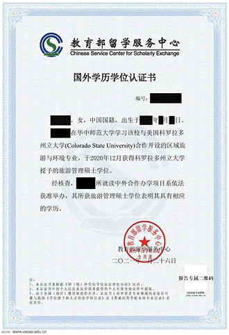 每年招生计划为60人。按照华中师范大学和美国科罗拉多州立大学共同制定的培养标准,修满35学分的学生,可获得由美国科罗拉多州立大学颁发的公园与保护地管理硕士学位证书(图2),并可在教育部留学服务中心官网进行学历学位认证(图3)。