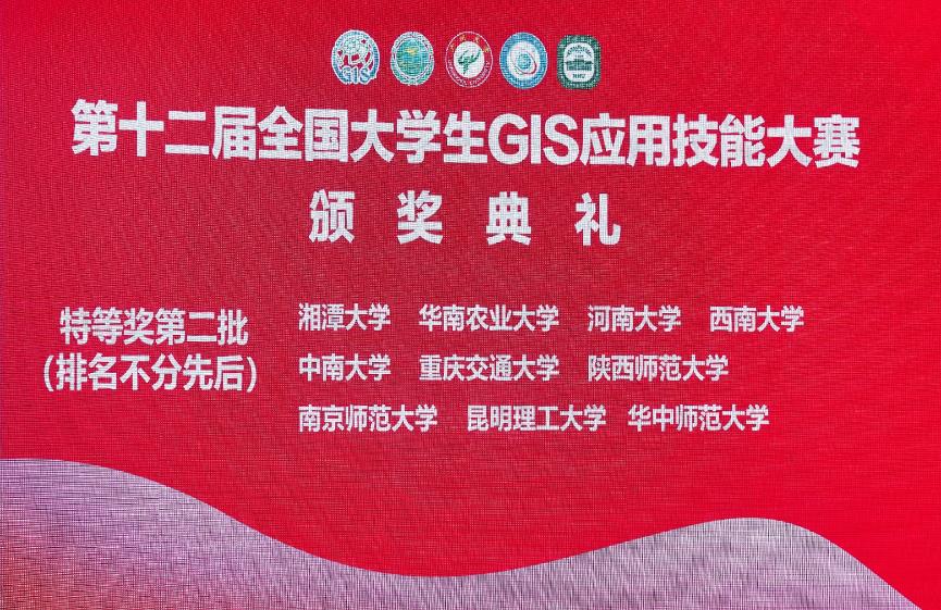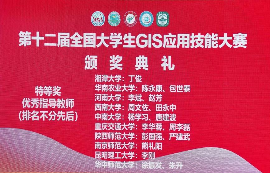 2023年12月1日-3日,由中国地理信息产业协会、中国地理学会主办的“第十二届全国大学生GIS应用技能大赛”在广州大学落下帷幕。该比赛为我国地理信息教育界水平最高、规模最大的大学生技能大赛,共吸引全国193所高校、768名学生、345名指导老师参赛。经过激烈角逐,我院2021级地理信息科学专业的左彤欣、饶晓悦、宋睿祺、姜佳璇(排名不分先后)四位同学组成的代表队斩获大赛特等奖,实现了我院在该项比赛连续四年获得特等奖的优异成绩。指导老师涂振发、朱升被评为优秀指导教师。