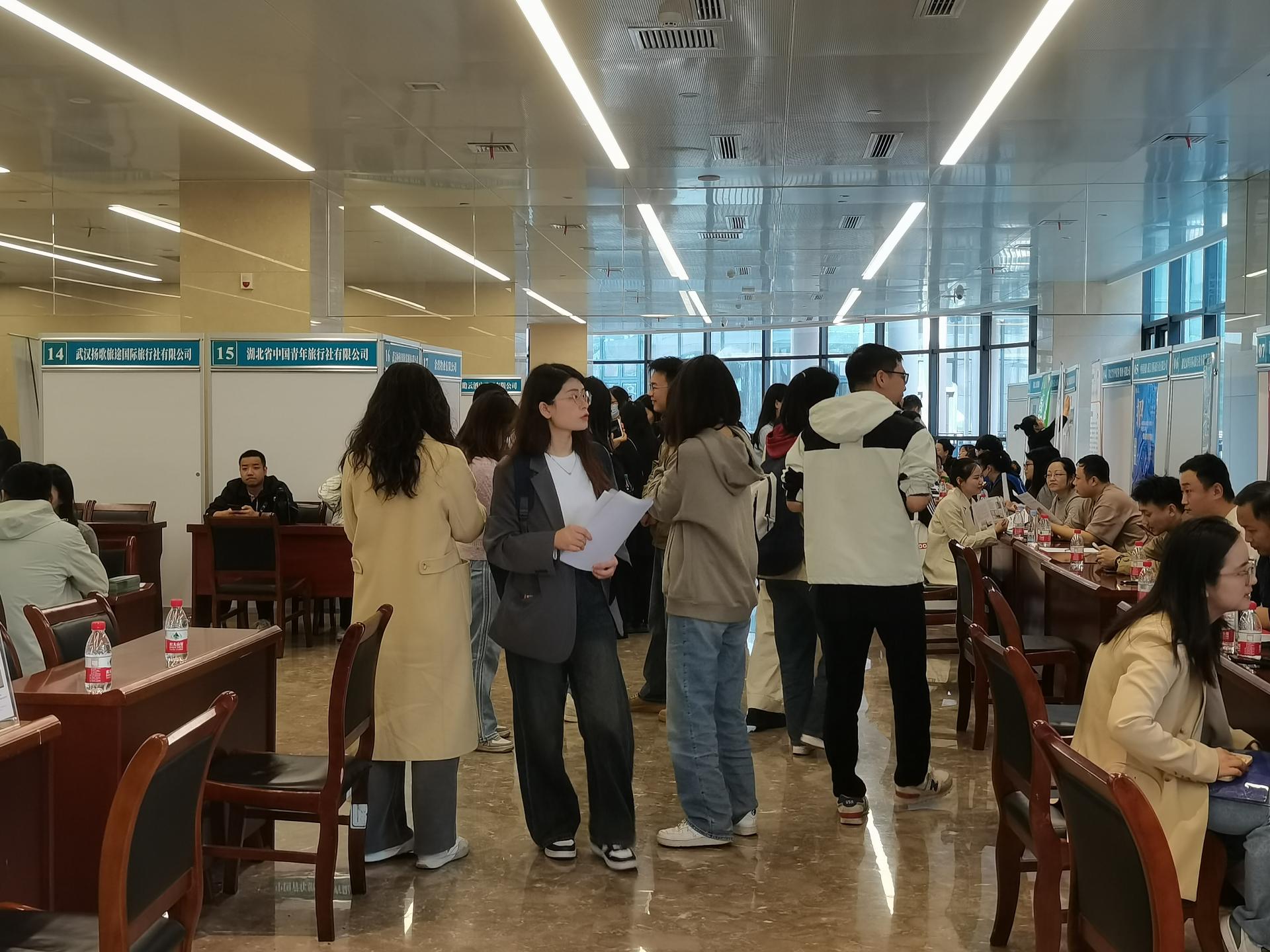 本次招聘会热度非凡,现场近40家旅游相关企事业单位,为毕业生们提供300+就业岗位,吸引了包含华中师范大学、中南财经政法大学、湖北大学、江汉大学、美国科罗拉多州立大学、新疆大学、哈尔滨商业大学等高校的毕业生前来求职。招聘会现场气氛热烈,人潮涌动,前来应聘的毕业生穿梭各单位招聘展位前,积极主动与用人单位沟通交流,详细询问企业情况、岗位职责、福利待遇等相关信息,对心仪的单位进行深入了解;部分用人单位现场对求职毕业生进行了面试。