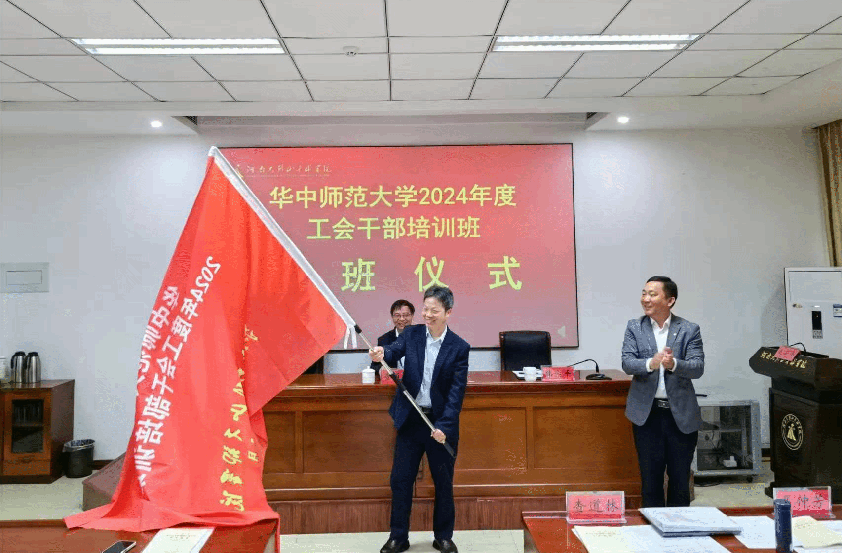 4月12日至14日,学校在大别山干部学院举办了2024年工会干部培训班,湖北省教科文卫体工会主席熊晓泉、学校党委副书记兼工会主席查道林作了专题辅导报告。七个学院围绕党建抓工建的特色做法进行了典型经验交流,其中我院党委书记吴成峡代表学院在培训班作了题为《落实“三有”工作思路,打造“三心”品牌工程》的工会工作交流汇报,院工会主席李星明作为学员代表接受了大别山干部学院领导授予的班旗。