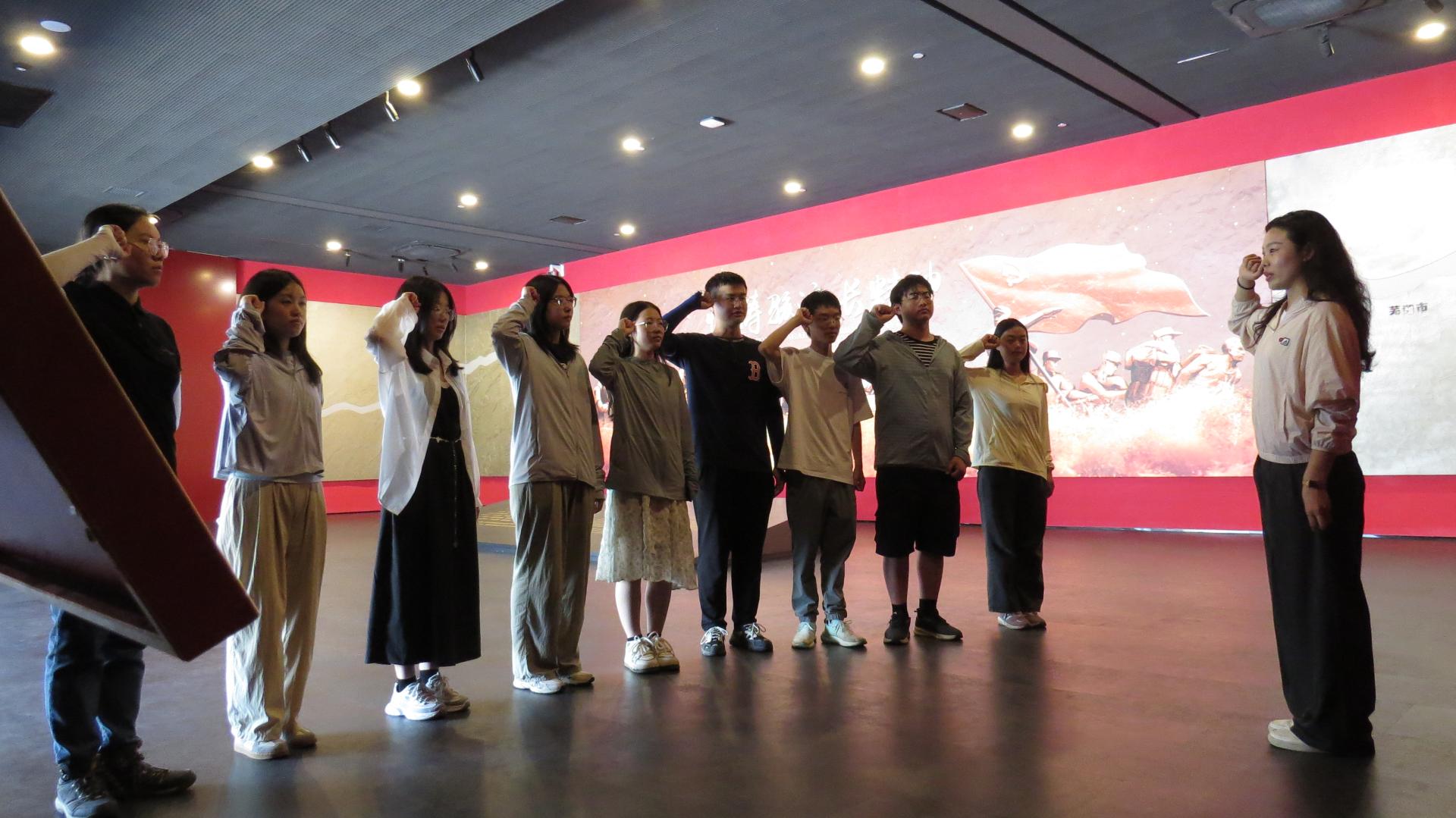 在之后的主题党日活动中,带队老师、“经纬领航”学生党支部书记王曼玉带领支部成员重温入党誓词。师生们深入交流,支部成员、退伍士兵罗华洁还分享了自己退伍前采访1998年抗洪士兵时的感受。