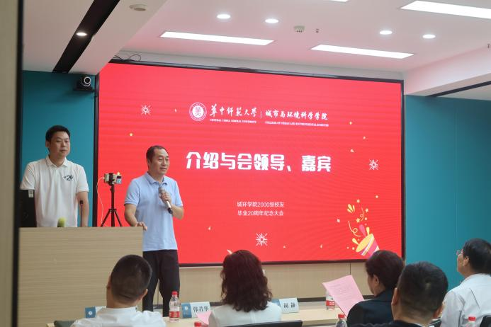参观结束后,校友们一同前往学院会议室参加城环学院2000级毕业二十周年纪念大会。华中师范大学校党委统战部常务副部长、城环学院2000级本科生辅导员代表王长华,校党委学生工作部副部长、就业处处长韩君华,城环学院党委书记吴成峡,城环学院2000级本科生辅导员、院长敖荣军,城环学院龚胜生教授、胡静教授、李星明教授等及部分退休教师代表参加会议。会议由城环学院党委副书记李志雄主持,大会采用线上形式同步直播。