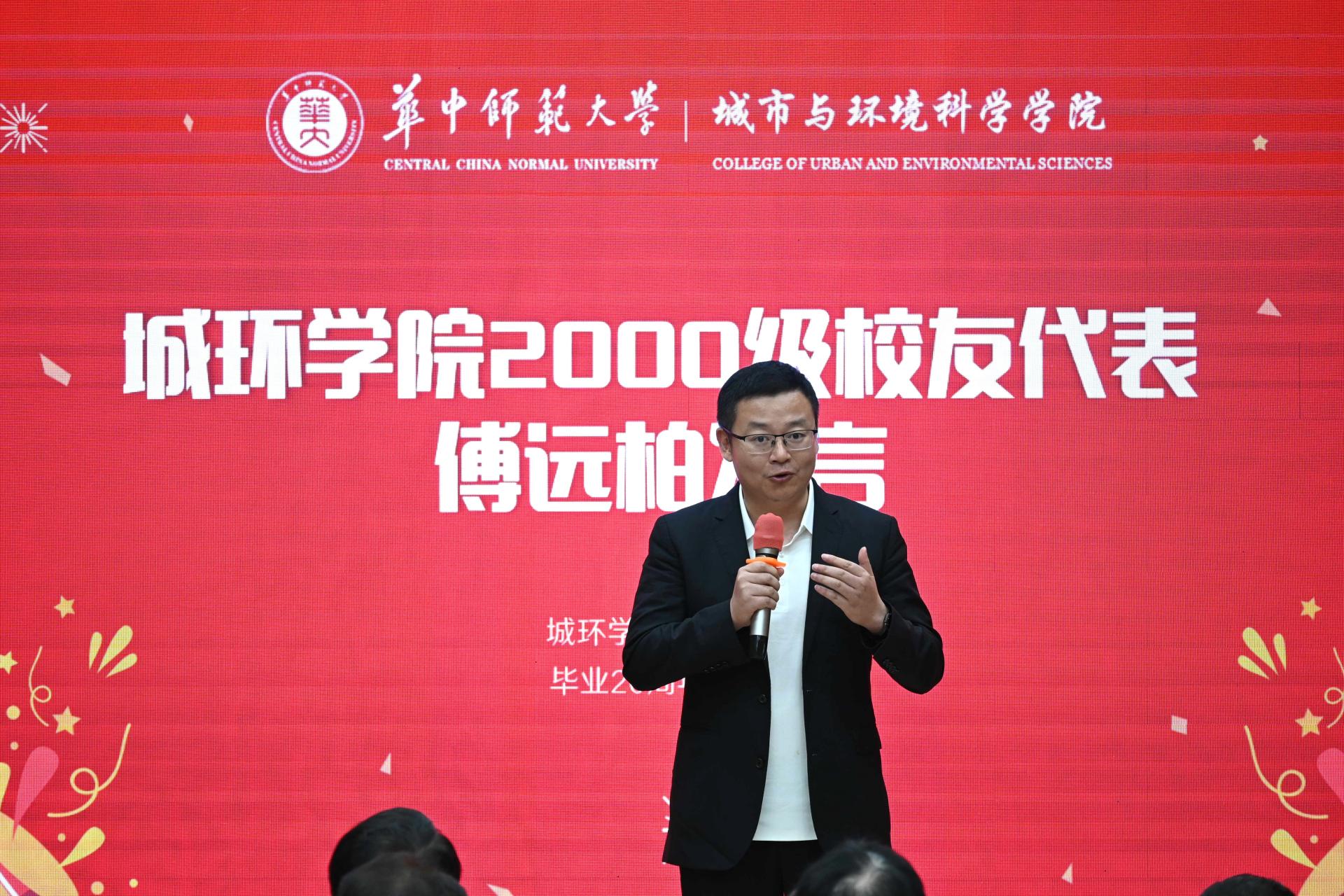 毕业生代表傅远柏听完老师们的发言后,表示深受启发,仿佛又回到二十多年前的大学时代。他通过华师情谊、华师气息、华师记忆、华师精神、华师嘱托等五个关键词,对母校表示诚挚感谢,深情回顾学生时代,真情分享毕业感悟。他表示,校友们将牢记“求实创新、立德树人”的校训,秉承“忠诚博雅、朴实刚毅”的华师精神,响应母校倡导,爱国爱民、爱人爱己,爱家庭爱事业,爱天下可爱之人,爱天下可爱之物,真正领会与践行“爱在华师”的内涵与真谛,在各自的领域做出更大的成绩与贡献。