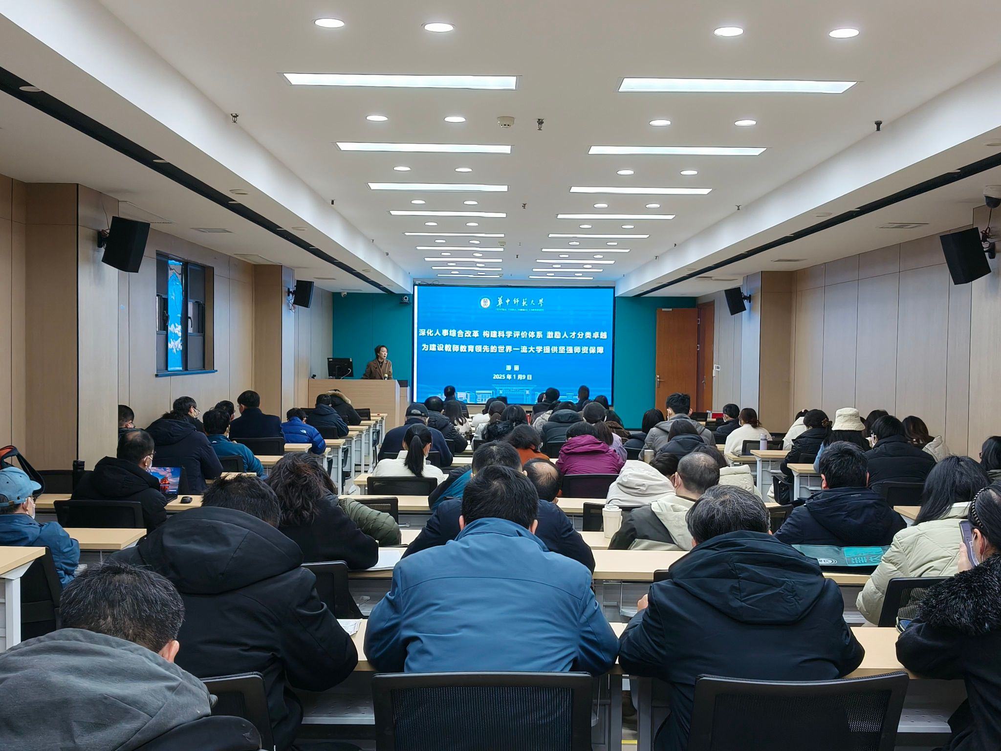 1月9日上午,学院开展学习贯彻党的二十届三中全会精神宣讲会,学校人事部部长游丽作题为“深化人事综合改革 构建科学评价体系 激励人才分类卓越 为建设教师教育领先的世界一流大学提供坚强师资保障”报告。学院全体教职工参加。会议由院党委书记吴成峡主持。