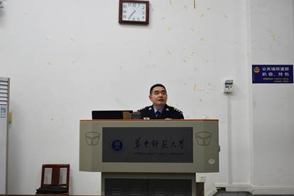 周继军警官首先向同学们介绍洪山区基本治安情况,表示洪山公安分局会将继续以“不忘初心,守护洪山”作为准则,积极投身于洪山区法制环境的优化推动中,为广大市民、包括广大高校学生营造更加安全的学习生活环境。