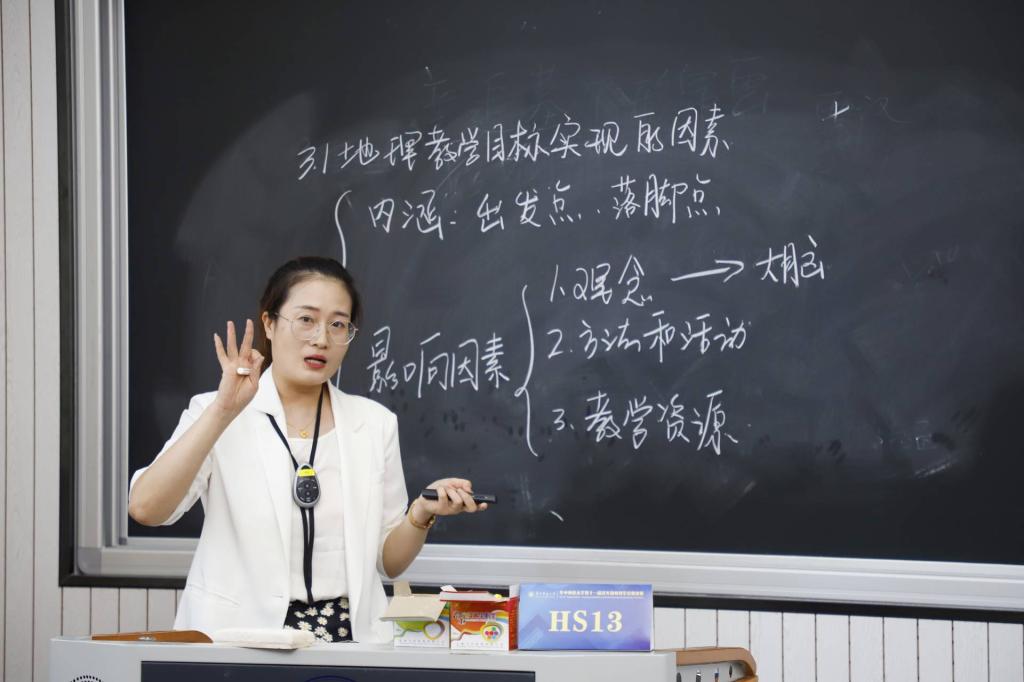 第二阶段:决赛期间,常珊珊老师结合地理学科专业特点,抽取了《中学地理教学设计》这门课的一个片段《地理教学目标设计的依据》,在“有理想信念、有道德情操、有扎实学识、有仁爱之心”的四有好老师为思想引领,以“坚持以学生为中心”、“强调培养师范生的师德践行能力”、“基于目标设计教学”三大理念设计和呈现教学,在教学过程中,既结合中学教师案例又与运用地理实验互动教学,用精彩生动的语言和逻辑完整的板书展开课堂教学。