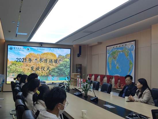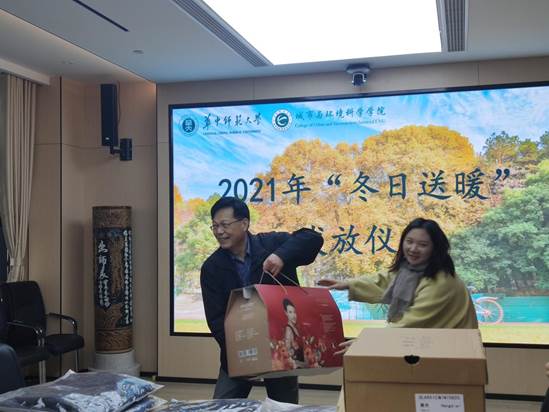12月8日中午12:00,城市与环境科学学院2021年“冬日送暖,情满城环”发放仪式在十号楼南楼607会议室如期举行。学院党委书记梁志群、党委副书记饶艳萍以及全体辅导员参与本次活动。