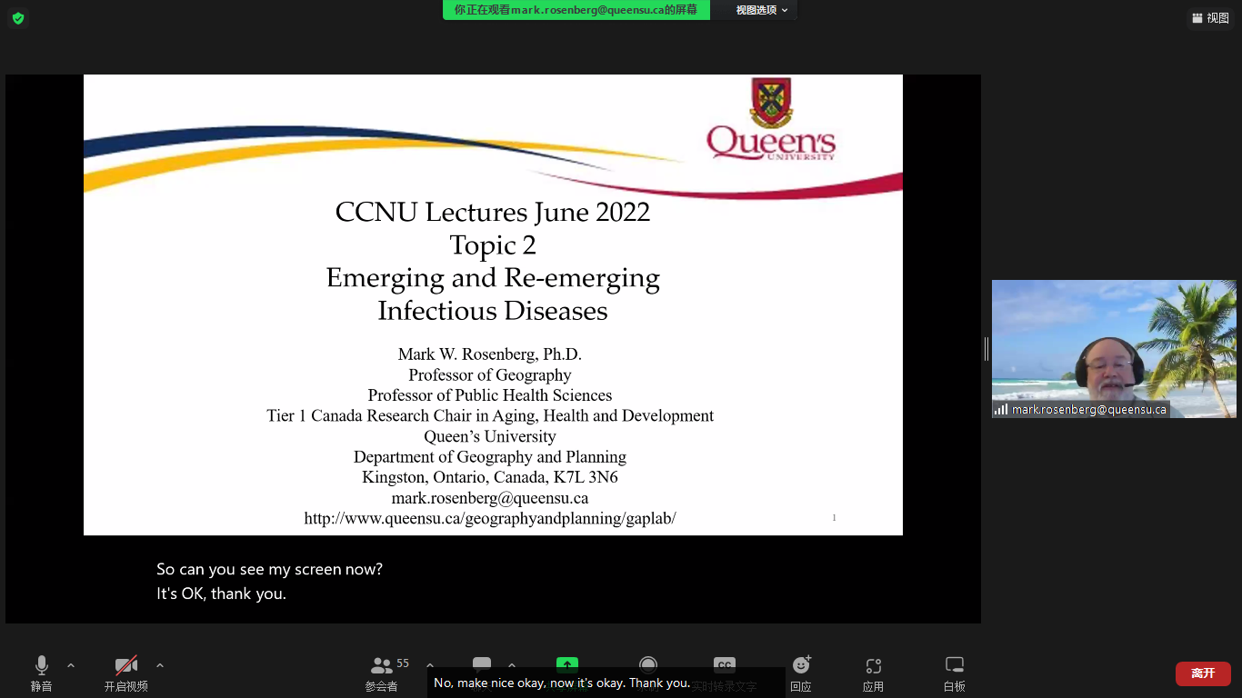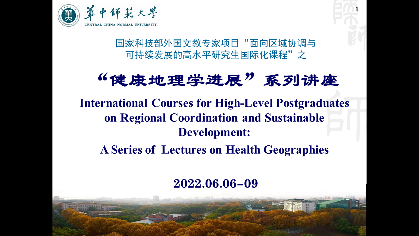 2022年6月6日至6月9日,国家科技部外国文教专家项目—— “面向区域协调与可持续发展的高水平研究生国际化课程”之健康地理学进展系列讲座顺利举办。本场讲座采用线上模式,由加拿大女王大学地理与规划系、公共健康科学系终身教授Mark W. Rosenberg教授主讲,华中师范大学城市与环境科学学院院长敖荣军、副院长谢双玉、龚胜生、梅琳、张涛和王婧等老师主持或参与讲座,近百名本科生和研究生在线参与学习。