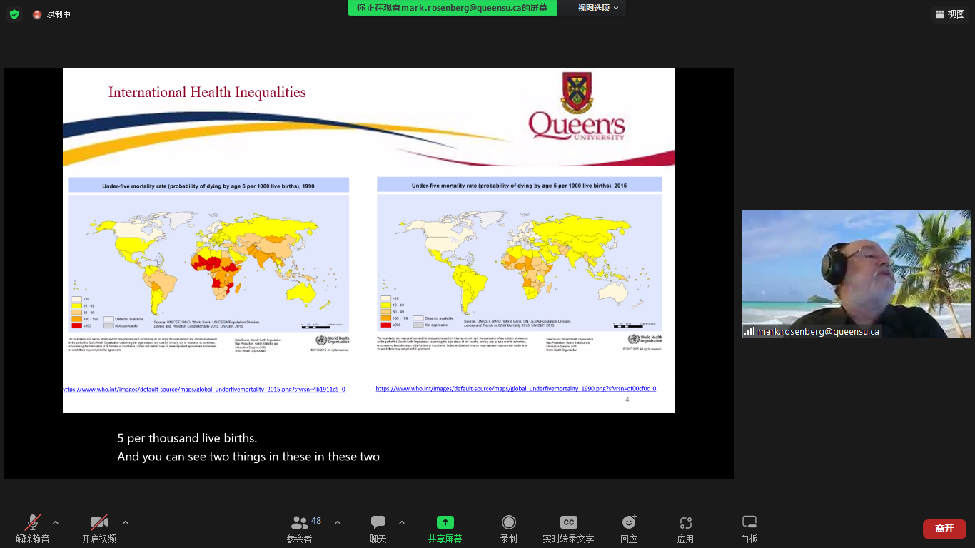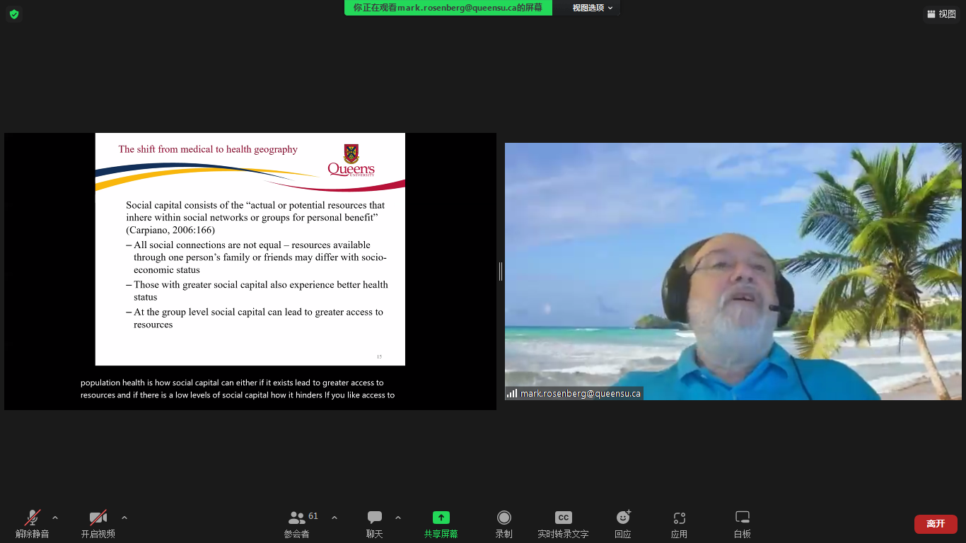6月8日晚上20点30分,第三讲为“Geographies of Health and Health Inequalities ”(健康和健康不平等地理)。Rosenberg教授主要从了解国际卫生的不平等现象、了解加拿大国家、区域、地方不平等现象以及关注健康和医疗保险不平等现象的重要性三个部分展开了此次讲座。他提出,健康不平等现象在不同的地域范围内存在,同时健康不平等的各种衡量标准及各种解释会受到个人因素、地区及环境因素的影响。同学们提出了年轻人应如何应对奶茶、烧烤以及其他油腻食物的诱惑、加拿大学者目前除新冠肺炎之外最关心的研究热点等进行了愉快的交流。