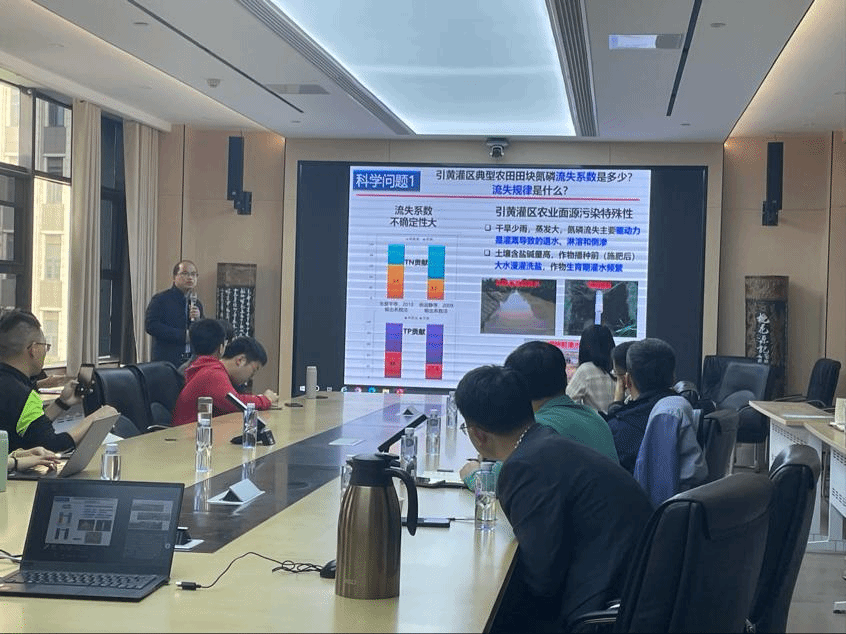 首先,由佘冬立教授进行本次沙龙主题介绍。然后,佘冬立教授结合自己已有的研究成果提出了几个科学问题:一为引黄灌区典型农田田块氮磷流失系数是多少?流失规律是什么?二为盐分养分共存情况下,面源氮磷在各级排水沟和地下水中的消钠去除规律?基于上述问题佘教授以试验场地布设及采样情况等数据分别进行了详细解释。