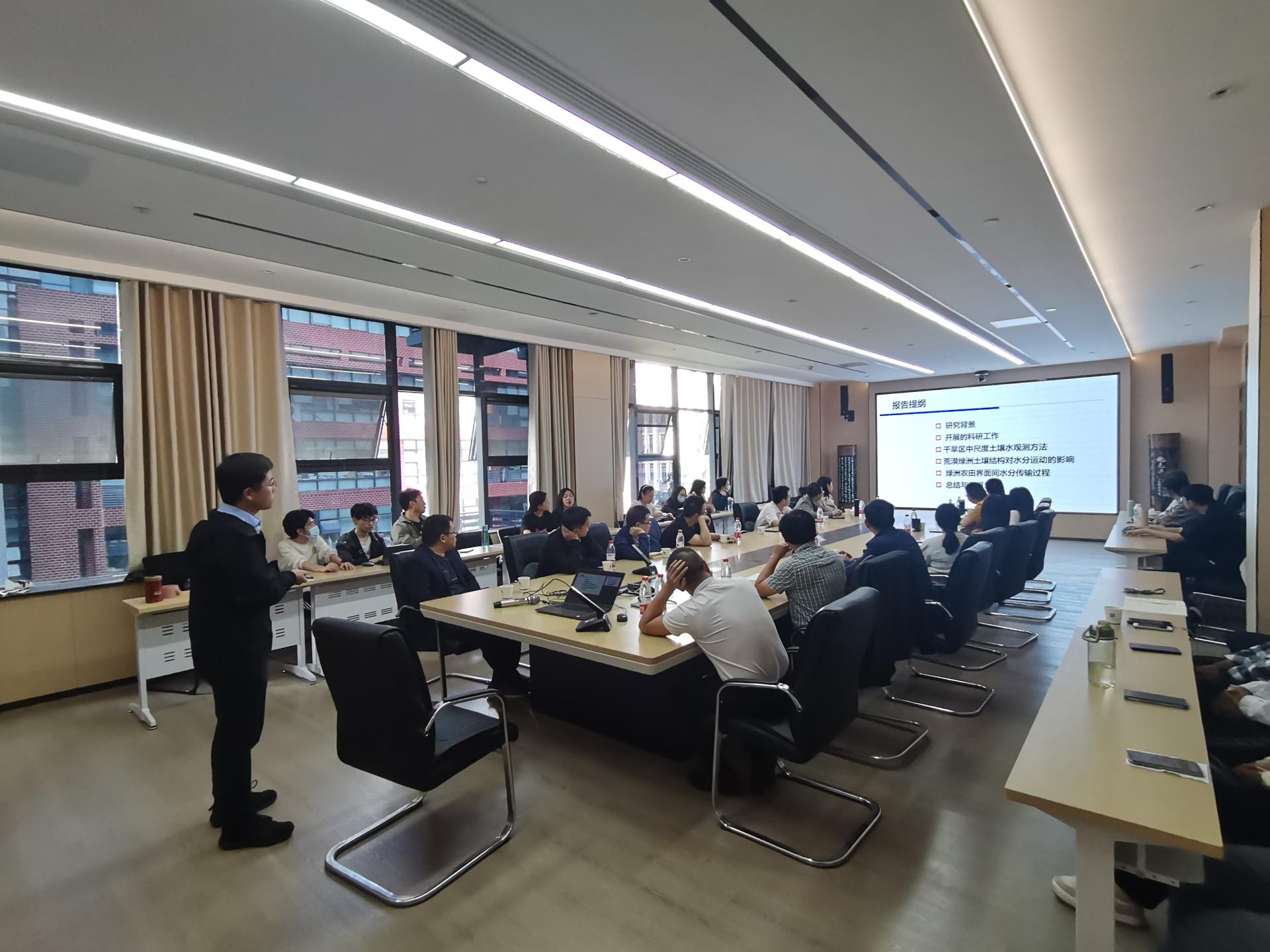 张勇勇研究员为大家带来了题为“荒漠—绿洲土壤水文过程研究”的学术报告,他主要介绍了研究背景、干旱区中尺度土壤水观测方法、荒漠绿洲土壤结构对水文运动的影响以及绿洲农田界面水分传说过程的相关研究,新颖的中尺度观测方法让大家大开眼界,受益非浅。
