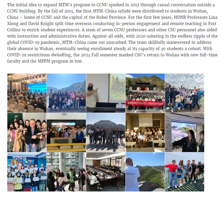 报道介绍两校合作起源于2012年科罗拉多州立大学教授到访学校时的一次闲聊,经过三年的筹备与组织,于2015年正式启动MTM项目的招生。合作期间,两校教学团队克服时差、距离和疫情等多方面的困难,结合线上线下等多渠道的教学方式,全面保障课程教学与项目运行。