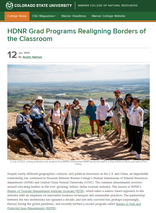 1月12日,美国科罗拉多州立大学华纳自然资源学院网站发布了题为“HDNR Grad Programs Realigning Borders of the Classroom”新闻,报道并介绍与我院合作举办区域旅游与环境(Master of Tourism Management,MTM)与自然旅游与生态保护(Master of Park and Protected Area Management,MPPM)硕士研究生教育项目的相关情况。