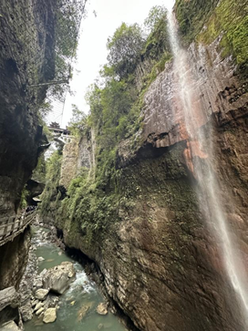 之后前往云龙地缝进行参观。云龙地缝,平面呈“之”字型,近南北向展布,全长3.6千米,平均深达75米,平均宽度15米,河谷深邃,岸壁陡直,近于平行,上下宽窄基本一致,断面呈“U”字形,有“十里百丈绝壁”之称。其中,五彩黄龙瀑布落差60余米,瀑水顺着似钟状的橙红色钙华体飞流直下,瀑水因含有黄铁矿而呈现黄色,下方即是五彩河,传说中女娲补天所用的五彩石来自于此。在这里能直观感受到大自然的鬼斧神工,感受地质景观的独特魅力,同学们伴着绝壁落水声沿栈道而下,被这大自然瑰丽壮观的杰作深深震撼。