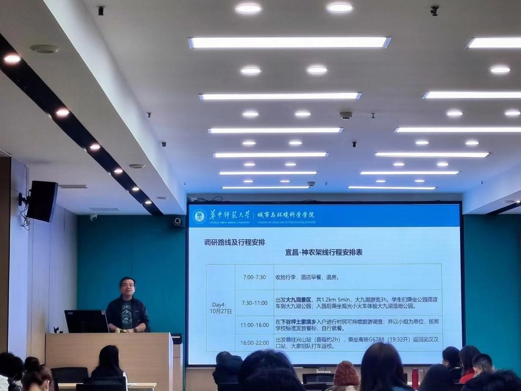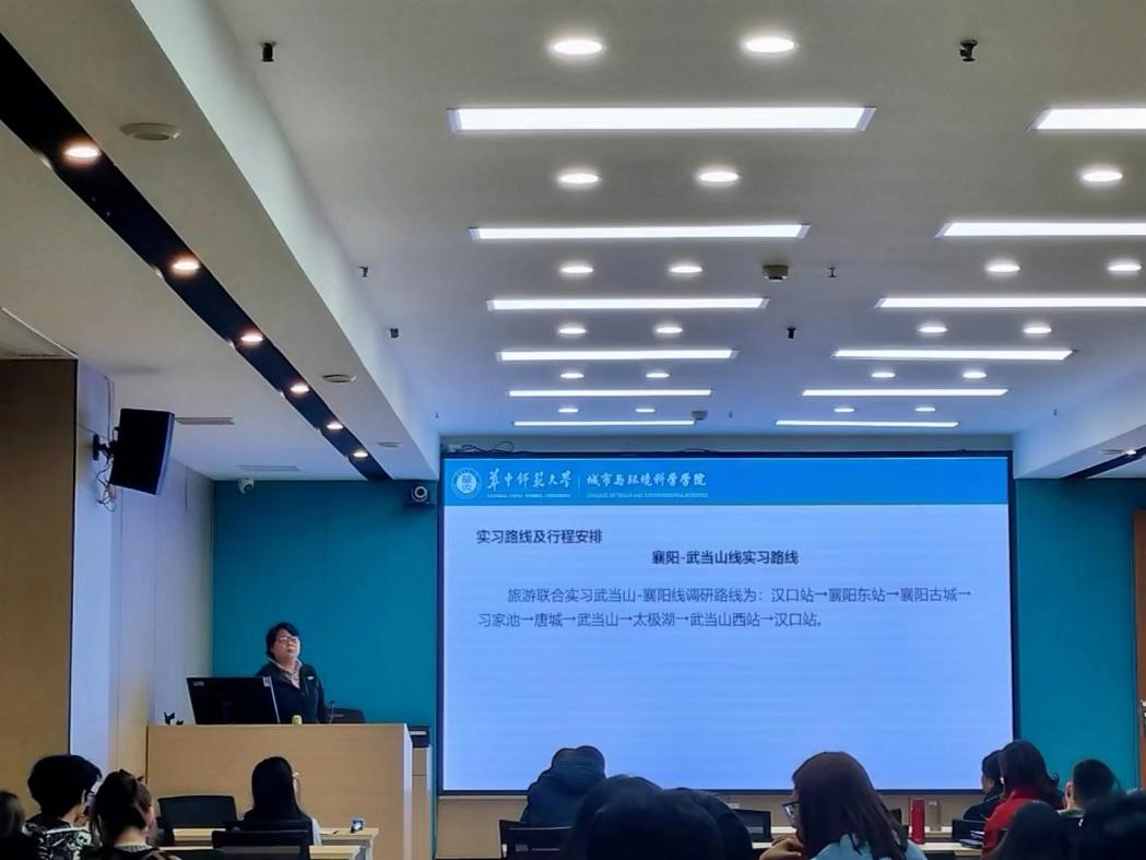 实习活动开展前期,谢双玉、胡静、李星明、张春燕、张祥、龚箭、王晓芳、乔华芳、程绍文、周杰、杨毅、周亲等多位老师就实习方案与安排等内容进行了深入的讨论与研究,并于10月22日在学院116会议室举行了实习动员会。会上,乔华芳老师对实习的整体安排进行了说明,并在小雅课程平台上布置了相关作业与任务。随后,乔花芳、龚箭、张春燕与程绍文四位老师分别就恩施线、宜昌-神农架线、罗田-英山线以及襄阳-武当山线的各项活动安排进行了详细的布置,并对不同地区的自然生态、文化生态、民族村寨等旅游地进行了介绍,以帮助同学们更好的做好实习准备,全面了解实习地的基本情况。