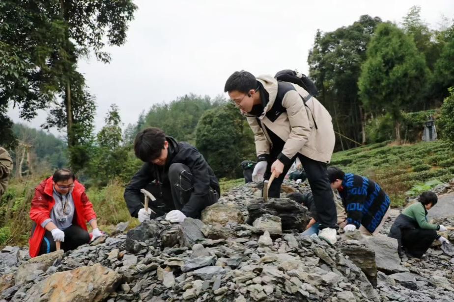 乘坐大巴至毛坝镇农科村,师生了解到三叶虫化石的成因、种类、基本识别方法,而后在恩施州古生物化石科普教育基地专家李老师的带领和指导下,考察了三叶虫、角石、腕足等化石富集的奥陶纪大湾组灰岩出露地层。