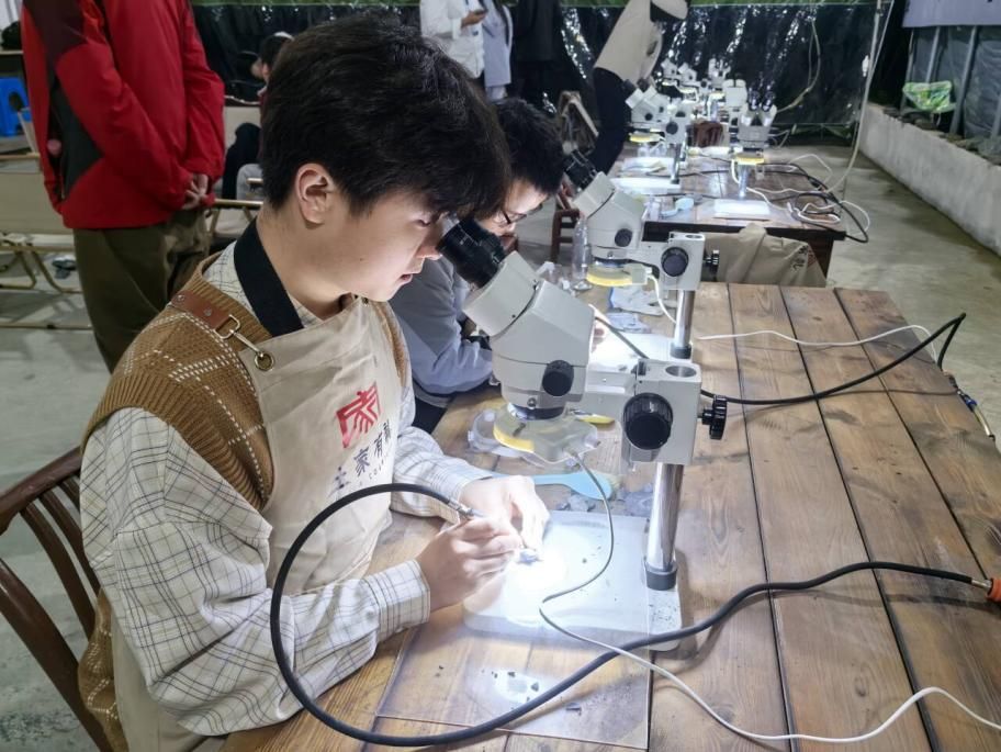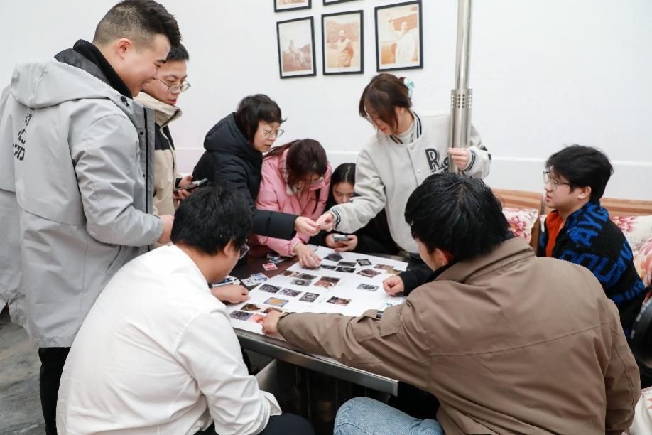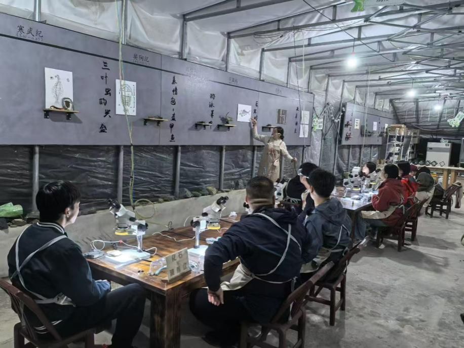 晚上,师生们在白鹊山村非遗工坊开展室内研修,湖北省地质科学研究院专家陈老师系统讲述了三叶虫自寒武纪至二叠纪长达三亿年的演化历程。随后同学们分组轮流开展了三个方面的动手实践,在化石清修环节中,同学们在非遗工坊老师的指导下,运用专业工具对采集到的标本进行精细处理,学习基础修复与技术要点;在“三叶虫演化过程排序”活动中,同学们按照老师所讲各个时期三叶虫的主要特征,将28张形态各异的三叶虫化石照片排列进自己画的地质年代;在“三叶虫生存挑战”模拟桌游中,沉浸式感受了生存环境的变化以及三叶虫的适应性响应机制与演化规律。