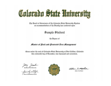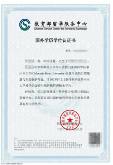 按照华中师范大学和科罗拉多州立大学共同制定的培养标准,修满规定学分并完成相关要求的学生,可获得科罗拉多州立大学颁发的公园与保护地管理硕士学位证书。该学位证书可在教育部留学服务中心官网进行学历学位认证。