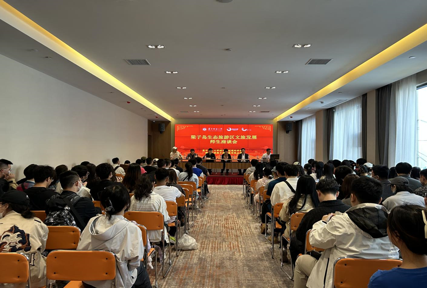 抵达梁子岛后,湖北文旅集团梁子湖旅游公司总经理郑大为和景区事业部总经理任启方热情地接待了来访的师生队伍,并举办了师生座谈交流会。交流会由城市与环境科学学院旅游管理系主任张祥副教授主持,张老师首先介绍了与会人员,随后任总对全体师生的到来表示了热烈的欢迎,他用精美的PPT向所有师生们介绍了梁子岛生态旅游度假区总体情况,包括梁子历史、全岛规划、更新策略等与梁子岛规划开发密切相关的内容,进一步加深了广大师生对梁子岛的了解和认识,特别是其中凝练出的12条梁子岛历史脉络令同学们感触颇深。“岛主”郑总也表达了自己作为华师学子,为母校老师和学弟学妹们的到来而倍感亲切。他认为做好梁子岛旅游不仅仅是一份工作,更是一份责任和担当,可以带动一方经济,造福一方百姓,这是很有意义的事情,也希望学弟学妹们可以在未来的工作中找到属于自己的价值。然后,胡静院长、谢双玉副院长、李星明教授分别做了交流发言,对梁子岛近年来的规划、开发和发展予以肯定,同时希望双方未来能够在梁子岛旅游开发项目中达成更多的合作,进而帮助梁子岛生态旅游度假区获得更多的发展机会和广阔的发展前景。