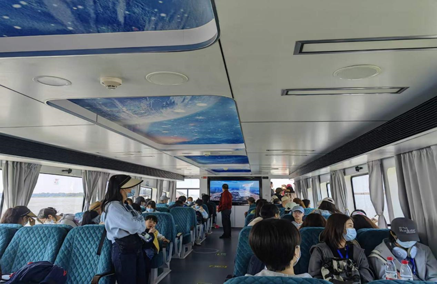 上午10点半,全体师生到达梁子湖码头,并在梁子湖码头乘坐游船前往梁子岛。梁子岛位于湖北省鄂州市梁子湖区,处于鄂东城市的中心地带,作为全国农业旅游示范点、省级旅游度假区,梁子岛自然环境优美,人杰地灵,有着2000多年的璀璨人文历史和丰富的旅游资源,享有“水上蓬莱”之美誉。乘船途中,同学们纷纷对游船内舒适安静的乘坐环境赞不绝口,美丽的湖景与蓝天白云伴随同行,更有许多同学前往船头、船尾处与微风吹拂的梁子湖合影留言,整个船舱中充满了大家的欢声笑语。