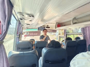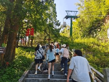 在行车的路途中,崔老师向学生们大致介绍了三角山的区位、由来和发展现状等内容并要求同学们在在游览过程中寻找并记录旅游区内的旅游资源和基础设施现状。通过仔细观察车窗外的景象,同学们发现三角山旅游区的服务项目和服务设施较为完善,不仅公共厕所,垃圾桶等分布合理,还为游客提供蹦极、登山和漂游等极限运动,室外露营、开放小木屋和特色住宿等旅游体验。此外,在行车的过程中也看到沿途道路上设有许多红色标语和红色文化宣传栏,可见三角山地区对红色旅游文化建设的重视。