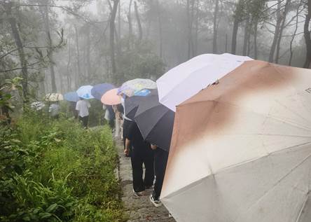 上午8时,全体师生准时从驻地出发。尽管细雨蒙蒙、雾气弥漫,师生们的考察热情依旧高涨。经过约一小时的车程,团队顺利抵达位于浠水县绿杨乡的梓木山庄。该山庄依托4000亩森林基底与白莲河水库千岛奇观,打造了集生态度假、运动赛事、文化体验于一体的综合性旅游目的地,已获评3A级旅游景区。