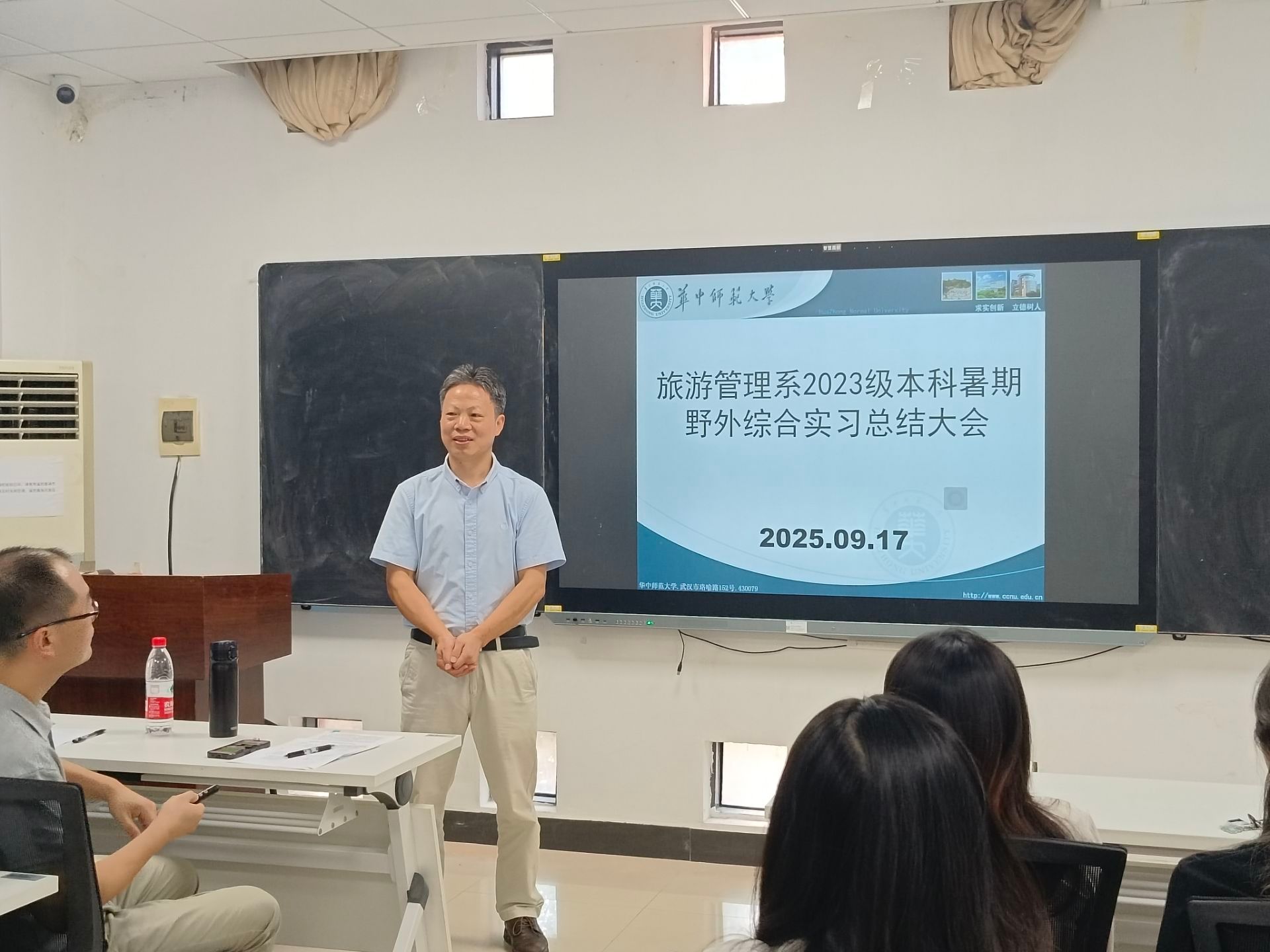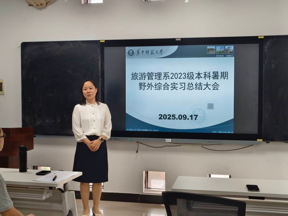为全面总结暑期野外综合实习经验,展示实践成果,深化实践教学改革,旅游管理系于 9月17日下午两点半在城环学院402教室召开了2023级本科暑期野外综合实习总结大会。学院副院长梅琳、旅游管理系主任张祥、旅游管理专业李星明、程绍文、辜红等老师以及2023级全体本科生参加了本次大会。会议由张祥主任主持。