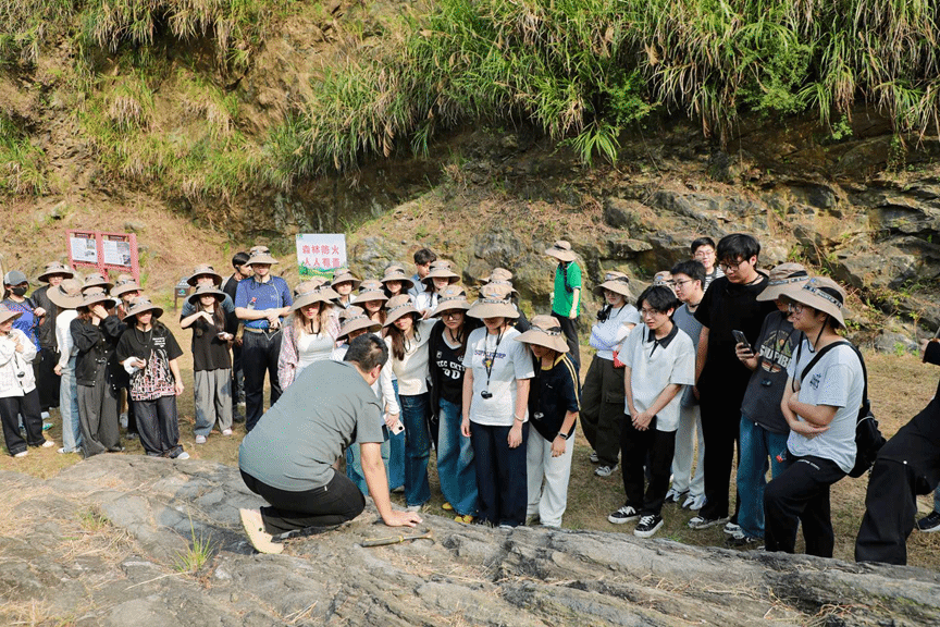 下午,队伍转至龟峰山进行实地考察,在地质专家指导下学习辨识岩石特征、分析地质构造,并实际操作地质罗盘测量岩层走向、倾角等数据。