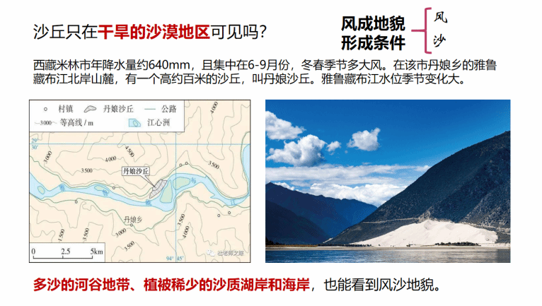 为保障课程质量,实习小组以“课标-目标-案例-评价”为思路组织备课。在深耕课标的基础上,小组成员研读各版本教材,确定本节课的教学目标和重难点。查找相关案例,最终确定以风成地貌为背景,设计情景式教学。考虑到风成地貌涉及风力侵蚀、风力堆积等抽象原理,为提升知识直观性,小组成员从航拍中国、中国国家地理杂志等途径筛选并下载乌鲁木齐米东戈壁滩、新疆雅丹地貌、巴丹吉林沙漠沙丘、黄土高原等典型风成地貌图片,并通过视频呈现风力对地表形态的塑造过程。