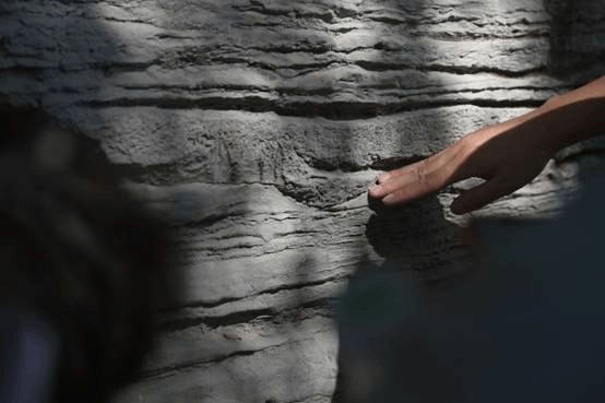 在潜海环境下,由于海水冲蚀,形成了大小不一、混杂有砾石、新老岩层叠合的条带灰岩。在新老岩层的交界面上有明显的下凹的剥蚀面,由于波浪和潮汐无法拥有如此强大的力量,因此可以推测是由于发生了风暴,老岩层才形成了下凹的剥蚀面。