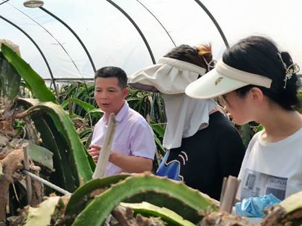 早上8:30,同学们与两位老师一同出发,于9:00到达浠水县洗马镇返乡创业园夏家铺村火龙果种植基地。夏家铺村谢书记带领同学们参观火龙果种植现场,并详细讲解了夏家铺村火龙果种植基地的发展历程以及基地对该村经济的影响,同学们对农业区位选择的影响因素有了更深的理解。