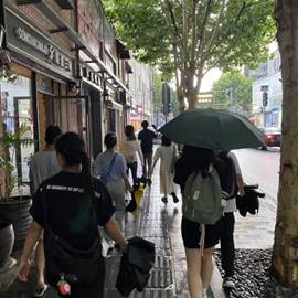 随后,同学们撑伞从江汉路走到中山大道。一路上,街道两旁的历史建筑向同学们诉说着一段又一段厚重的汉口往事,从曾经八国联军一直到今天的城市更新。同时街边纷繁多样的小店,又让同学们流连忘返。现代商业与历史文化的完美结合,让同学们感受到了汉口城市规划的包容与智慧。