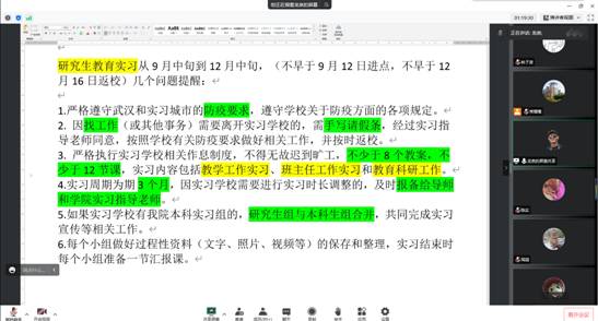 接下来,刘目兴副院长进行了讲话。他谈到,研究生实习机会来之不易,要珍惜研究性教育实习的机会,做好自己的论文研究,在锻炼教学实践能力的同时把毕业环节扎实做好。饶艳萍副书记也对同学们提出了一些希望和建议。除了希望大家能认真学习,虚心求教,展现个人能力与华师风貌,她还建议同学们要做好安全实习,做好协作实习,做到从容实习,利用好本次锻炼的机会,真正学有所得、学有所获。