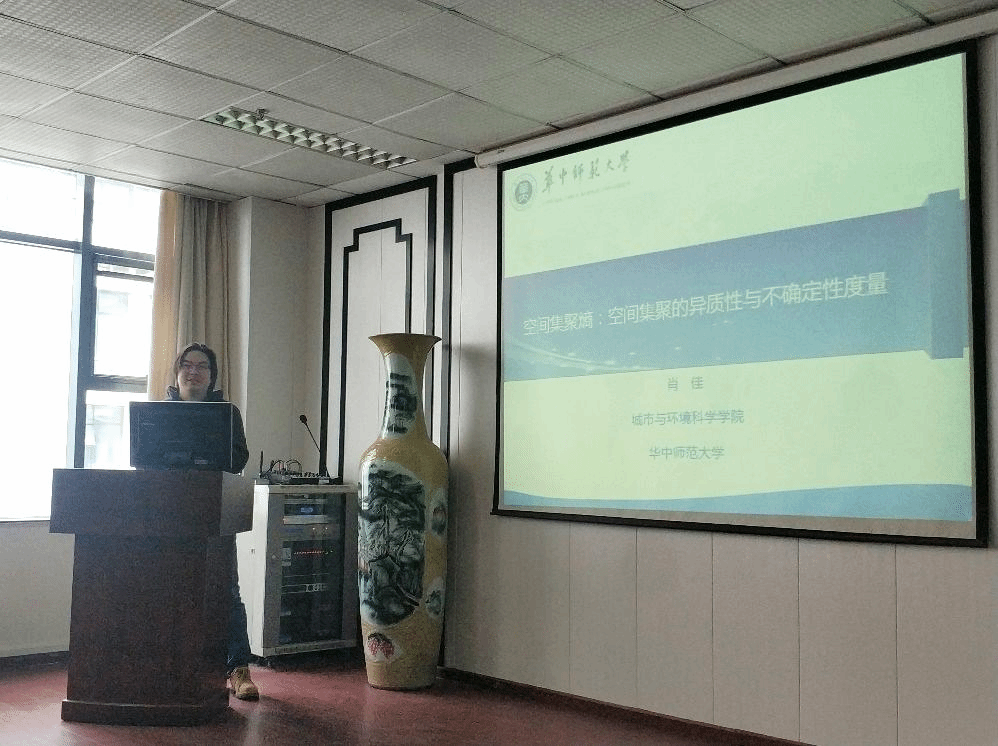 第一阶段,由肖佳老师进行主题报告分享。肖佳老师在报告中首先介绍了空间集聚熵的研究背景,指出可塑元问题(MAUP)是地理学相关研究领域中的一个基本问题,通常表现出“尺度效应”与“分区效应”,目前仍然没有对MAUP的统一认识和解决方法,如何对MAUP效应进行量化的研究就显得很重要。围绕空间集聚数据的异质性与不确定性,肖佳老师介绍了Michael Batty利用重力模型和最大熵模型的策略,同时也指出该策略的一个主要的缺陷是对于不同尺度空间集聚数据之间的信息熵,不能保持线性的可加性。随后,肖佳老师提出了新的研究成果,他认为统计假设可能是MAUP效应的关键,通过直接构造信息熵模型,计算两个空间集聚尺度之间的信息熵差异,基于信息熵理论的互信息,提出了具有尺度可加性与空间可加性两个重要特征的空间集聚熵模型。